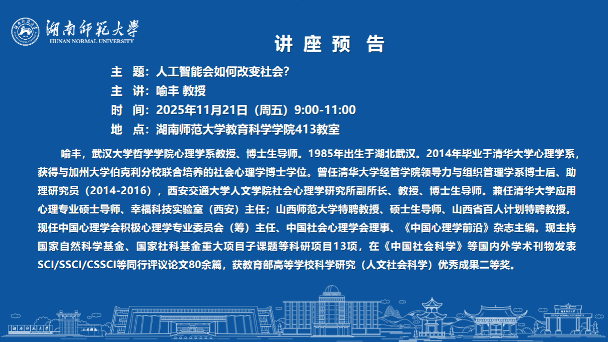 讲座预告—武汉大学喻丰教授讲座《人工智能会如何改变社会?》